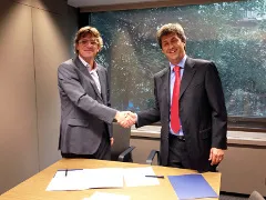 Imatge: de dreta a esquerra, el Sr. Fernando Pinillo, gerent de Roca Junyent, i el Sr. Albano Sanchez-Ossorio, degà del COETIC, en el moment de formalitzar la signatura del conveni de col·laboració entre ambdues entitats. Font: COETIC.